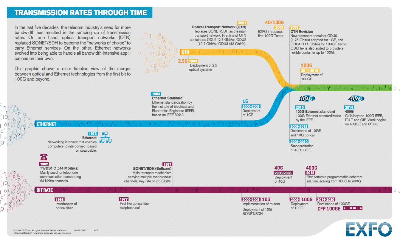 Did you know that it took 25 years to transition from DSn/PDH to SONET/SDH (1962 -1987), 14 years to transition from 2.5G to 40G (1990 – 2004), but only 5 years for 100G to go from definition to mass deployment (2009 – 2014)?